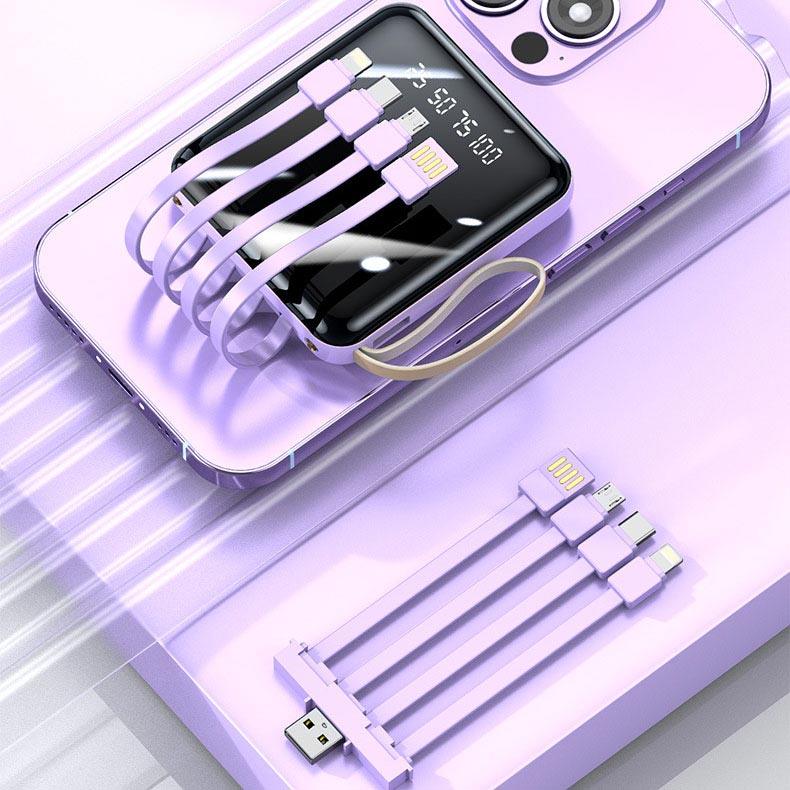 Check out our Fast Charging 20000mAh Mini Power Bank with Built-in Cables - the ultimate solution for all your charging needs.